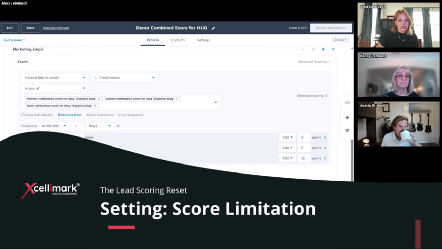 Set Limits: Use the "Limit score to" feature for low-value actions like clicking a Call to Action (CTA). For example, if you assign 5 points per click, you can cap the total points from that rule at 10 or 20 to avoid exhausting the score group.
